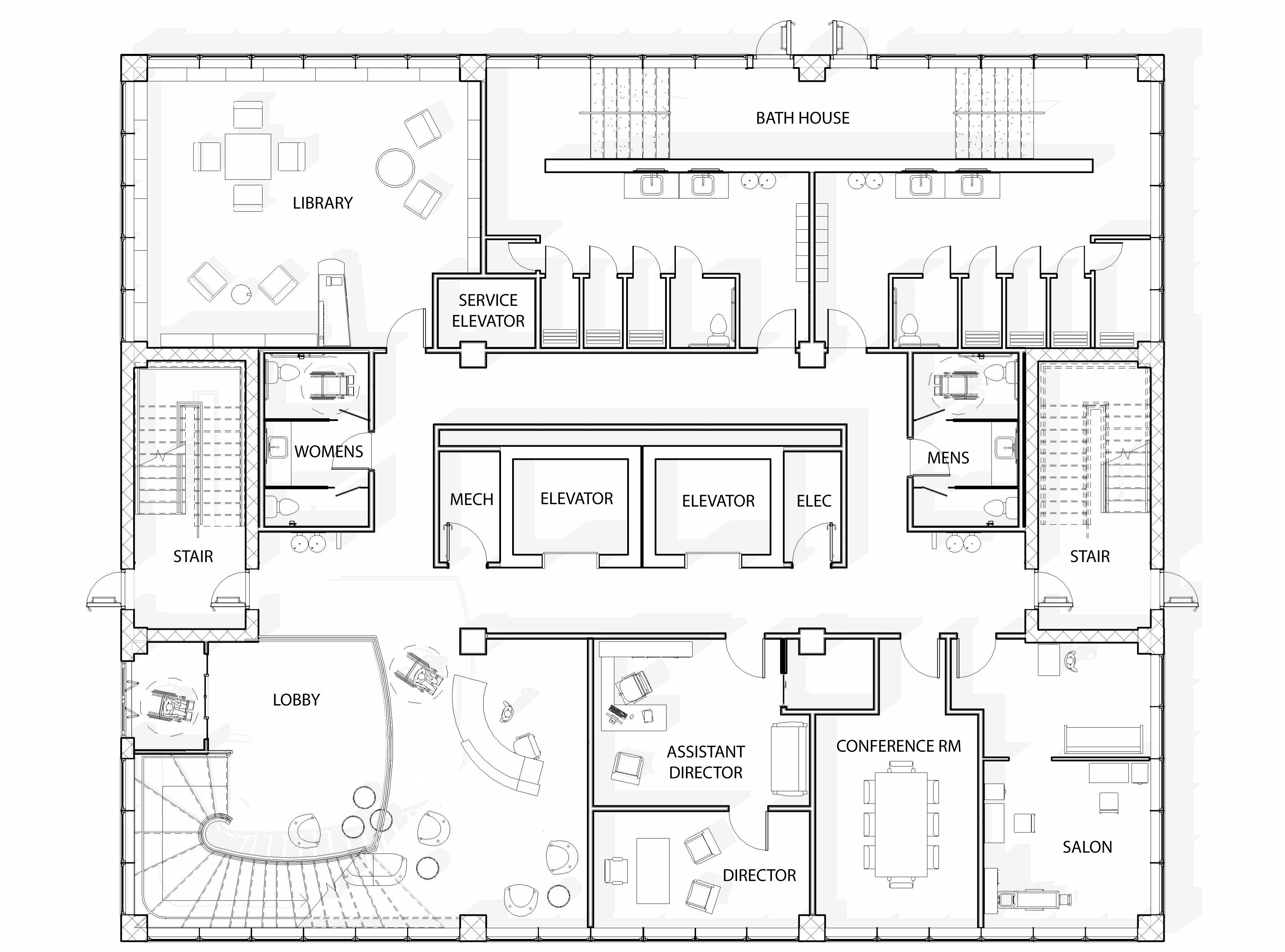 LOBBY LIBRARY BATH HOUSE ADMIN ASSISTANT ADMIN DIRECTOR CONFERENCE RM SALON RESTROOM RESTROOM SERVICE ELEVATOR ELEC MECH POSTAL BOXES ELEVATOR ELEVATOR STORAGE DINING KITCHEN MULTIPURPOSE RM STORAGE DIRECTOR ELEVATOR ELEVATOR ELEC MECH RESTROOM RESTROOM SERVICE ELEVATOR STAIRS STAIRS STAIRS STAIRS HOUSE KEEP