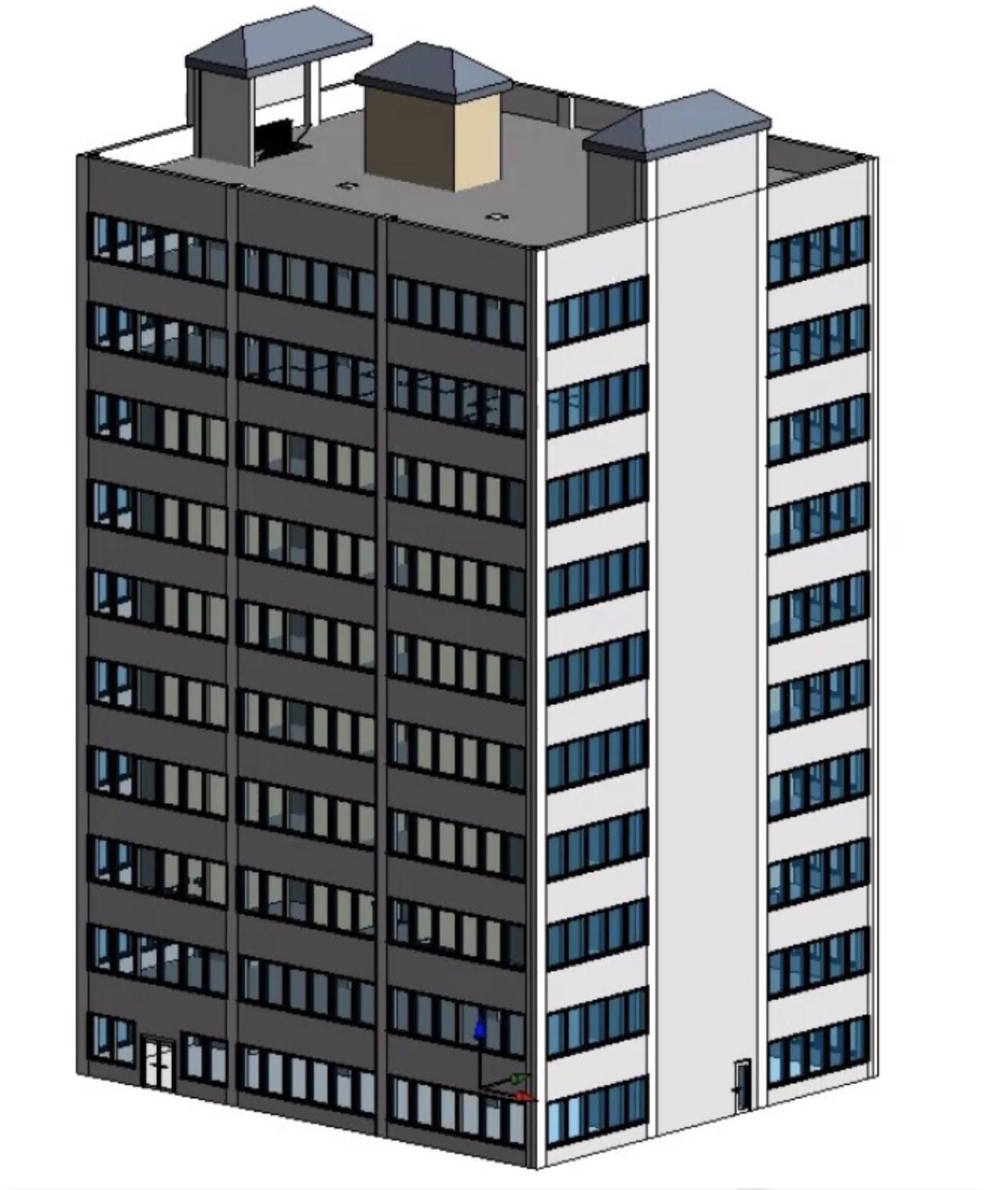 Each level is 4700 sq. ft. with large windows along the perimeter walls and a central elevator.