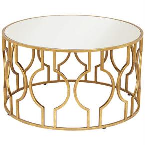 Antique gold leaf finish over openwork metal frame Mirror tabletop, beveled edges