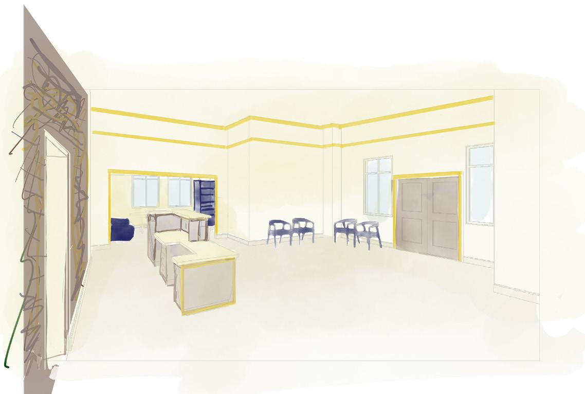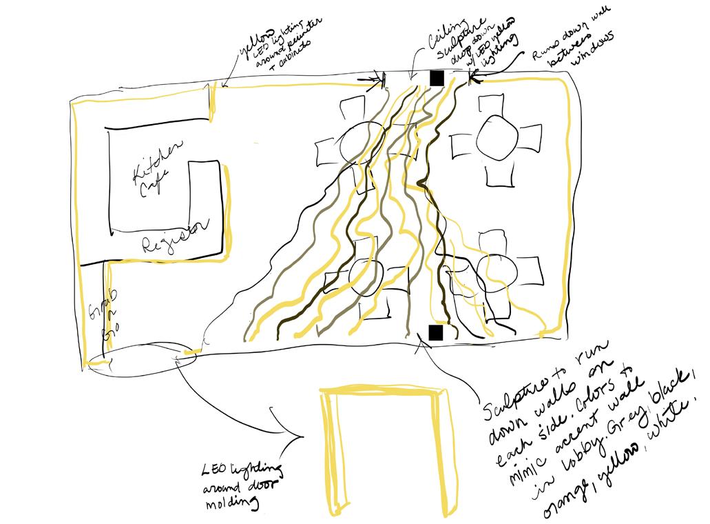 Ideation Sketching Incorporating the iconic yellow, the design will have organic lighting that flowis to the other side and down the wall. This lighting will create a focal point in the cafe which will be mimicked in the retail space. All doorways will be illuminated touching back to our concept.
