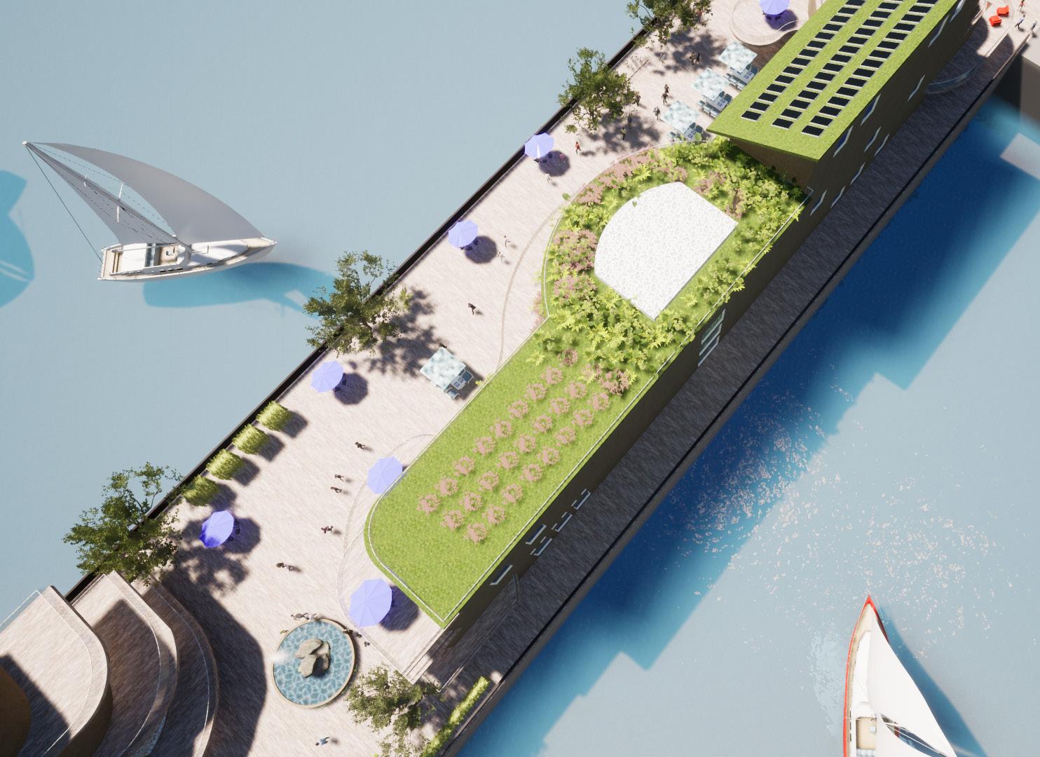 Ideation Rendering to visualized daylighting, solar location, roof gardens, and outdoor patios.