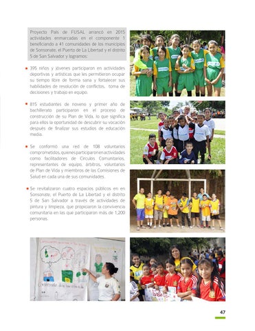 Proyecto País de FUSAL arrancó en 2015 actividades enmarcadas en el componente 1 beneficiando a 41 comunidades de los municipios de Sonsonate, el Puerto de La Libertad y el distrito 5 de San Salvador y logramos: 395 niños y jóvenes participaron en actividades deportivas y artísticas que les permitieron ocupar su tiempo libre de forma sana y fortalecer sus habilidades de resolución de conflictos, toma de decisiones y trabajo en equipo. 815 estudiantes de noveno y primer año de bachillerato participaron en el proceso de construcción de su Plan de Vida, lo que significa para ellos la oportunidad de descubrir su vocación después de finalizar sus estudios de educación media. Se conformó una red de 108 voluntarios comprometidos, quienes participaron en actividades como facilitadores de Círculos Comunitarios, representantes de equipo, árbitros, voluntarios de Plan de Vida y miembros de las Comisiones de Salud en cada una de sus comunidades. Se revitalizaron cuatro espacios públicos en en Sonsonate, el Puerto de La Libertad y el distrito 5 de San Salvador a través de actividades de pintura y limpieza, que propiciaron la convivencia comunitaria en las que participaron más de 1,200 personas.