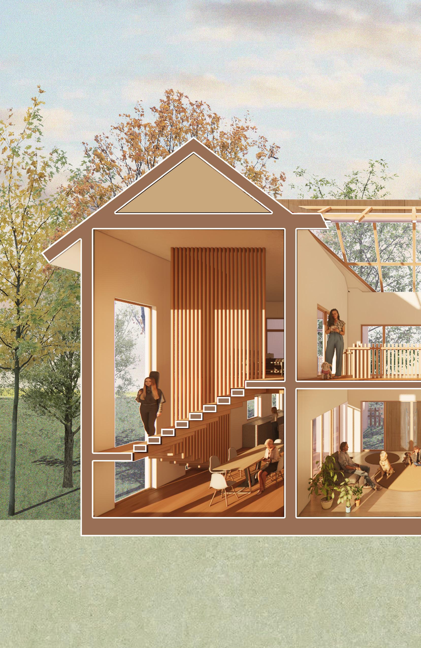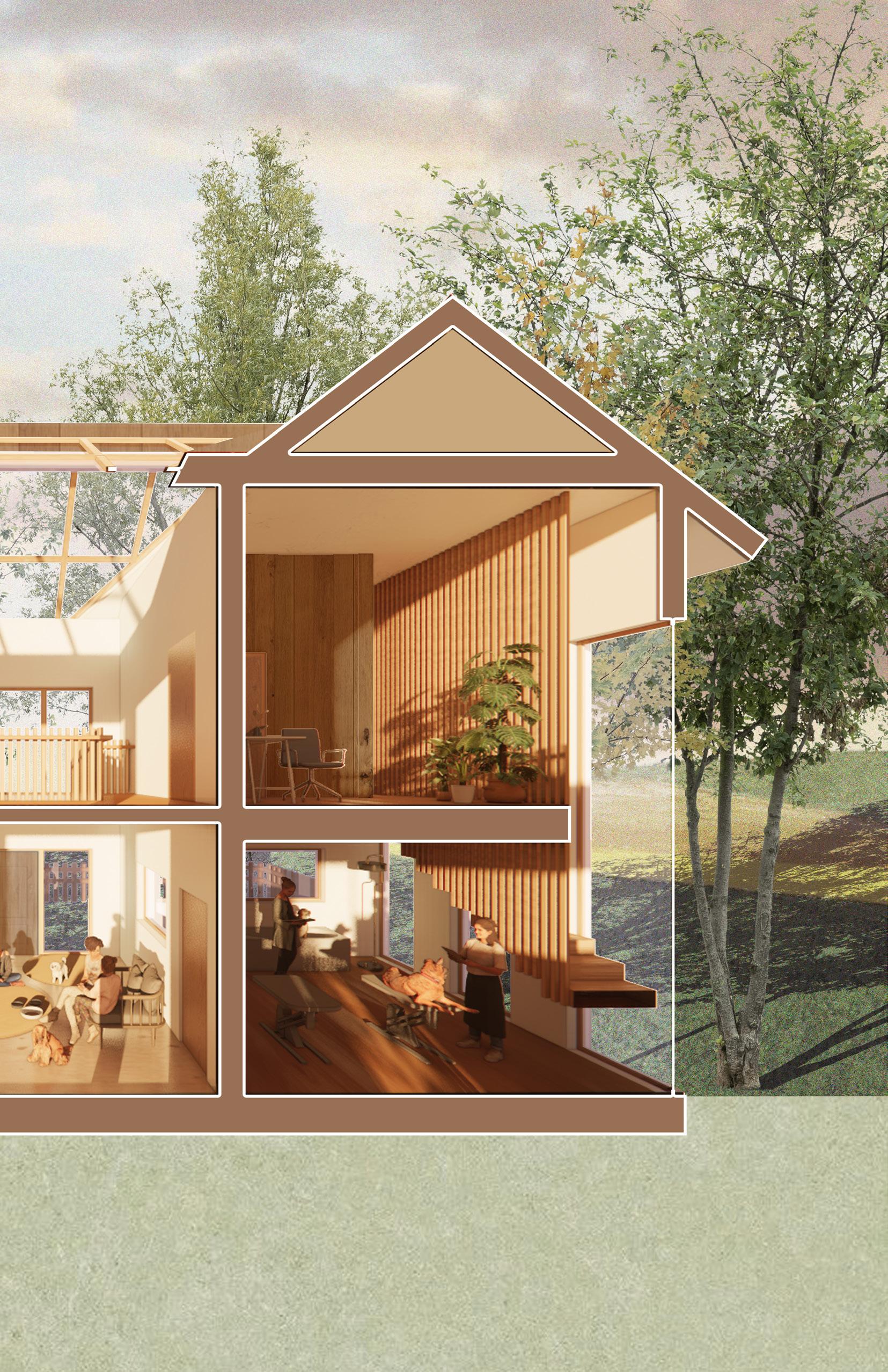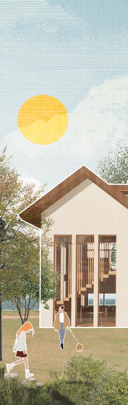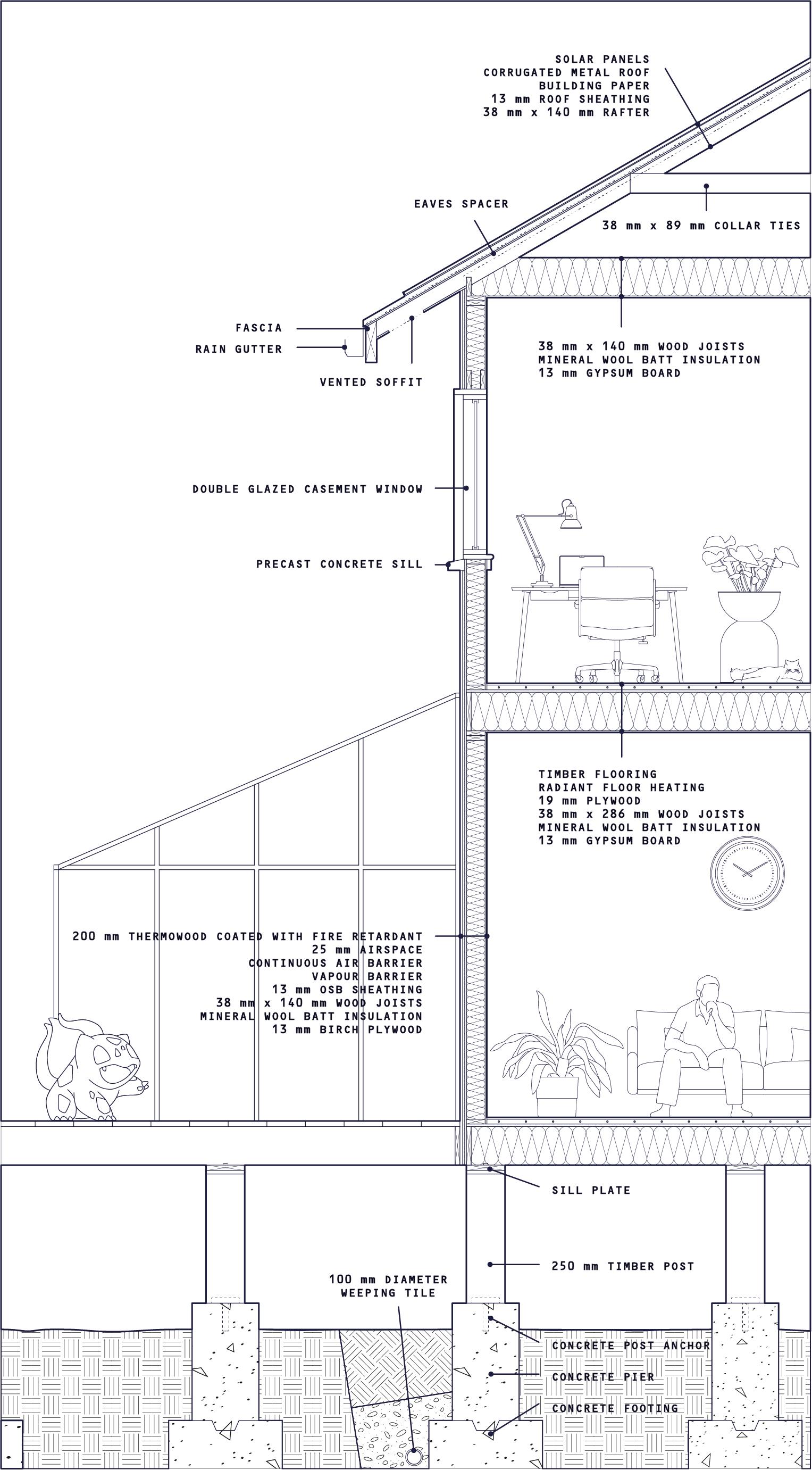 Over the past few years, British Columbia has encountered various climate hazards, including flooding, heat waves, and wildfires. Various design strategies were put into action to address the hazards posed by the changing climate. For instance, the use of thermowood as the exterior cladding of the building enhances its durability against severe weather and provides excellent thermal insulation to keep the interior warm during winter. Moreover, the house’s fire-resistant components, such as the mineral wool, batt insulation, corrugated metal roof, and wood elements coated with fire retardant, ensure that it can withstand wildfires. In addition, a geoexchange heat pump can cool the house during heat waves by transferring heat between the ground and the building. Given the abundance of rainfall in the Lower Mainland, the rainwater harvesting system enables the collection and storage of rainwater for human use. To mitigate the risk of flooding, the entire building is elevated on stilts, always remaining above the floodline.