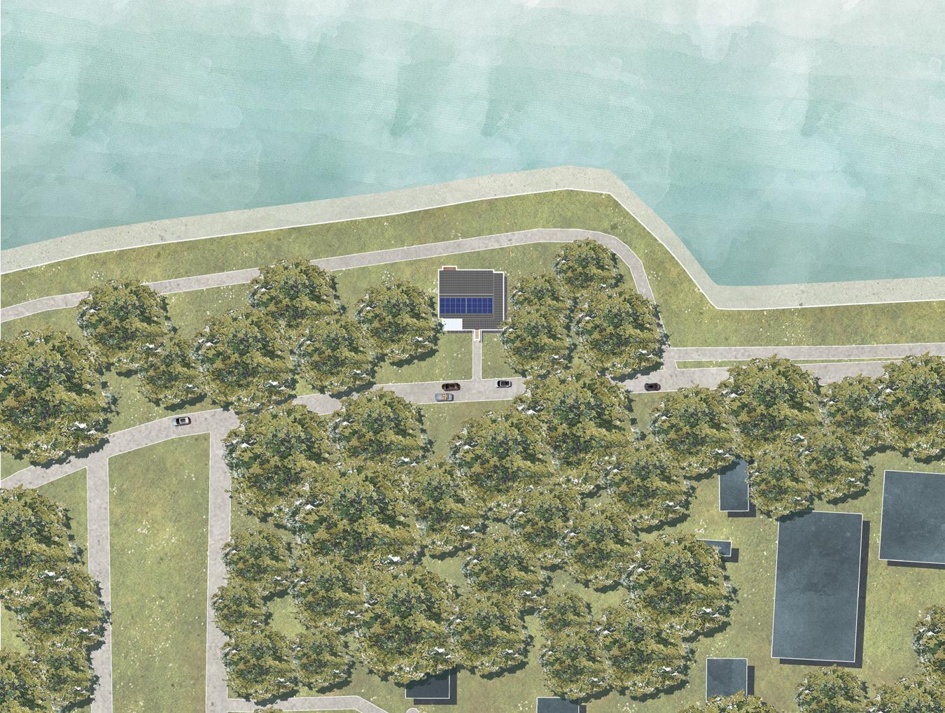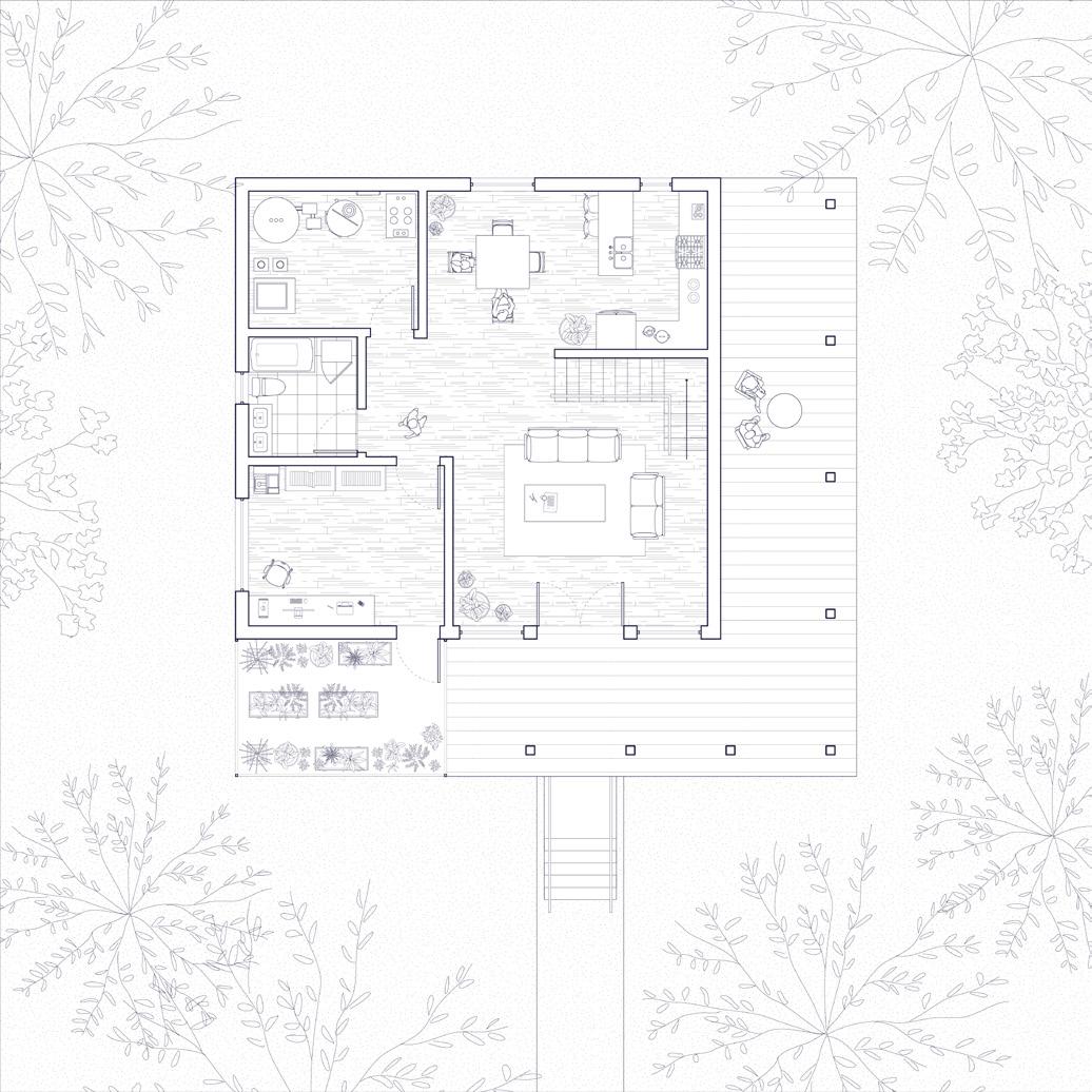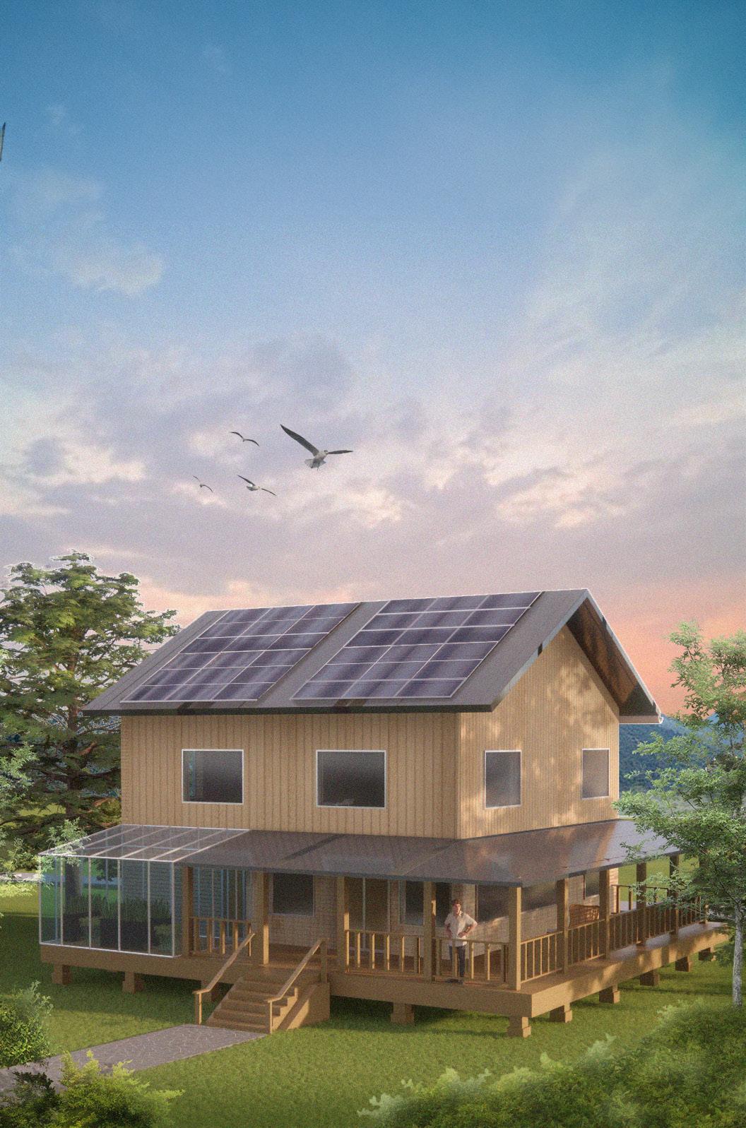 Over the past few years, British Columbia has encountered various climate hazards, including flooding, heat waves, and wildfires. Various design strategies were put into action to address the hazards posed by the changing climate. For instance, the use of thermowood as the exterior cladding of the building enhances its durability against severe weather and provides excellent thermal insulation to keep the interior warm during winter. Moreover, the house’s fire-resistant components, such as the mineral wool, batt insulation, corrugated metal roof, and wood elements coated with fire retardant, ensure that it can withstand wildfires. In addition, a geoexchange heat pump can cool the house during heat waves by transferring heat between the ground and the building. Given the abundance of rainfall in the Lower Mainland, the rainwater harvesting system enables the collection and storage of rainwater for human use. To mitigate the risk of flooding, the entire building is elevated on stilts, always remaining above the floodline.