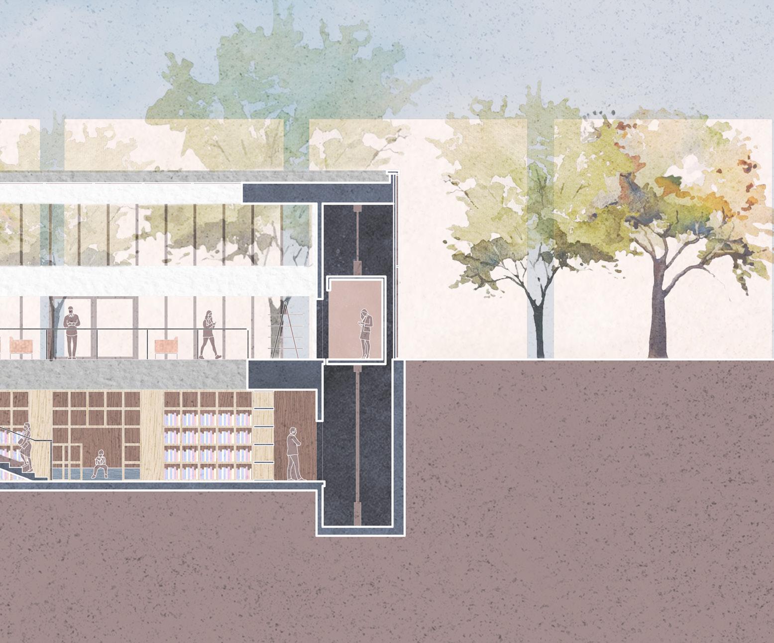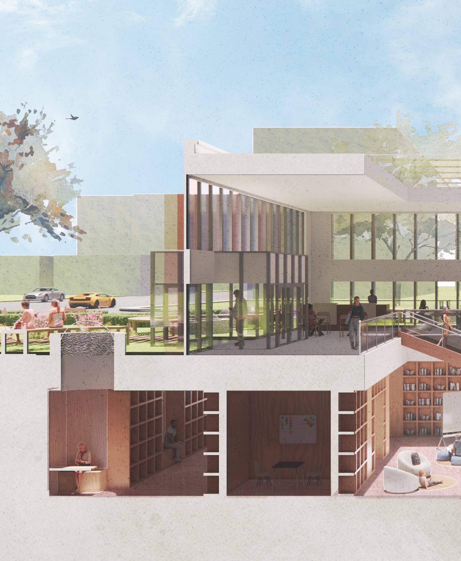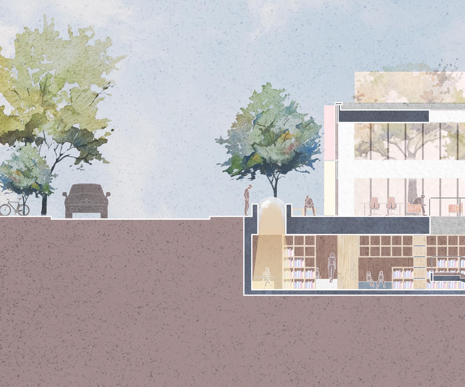 Situated in the intersection between Thompson Street and Broadview Avenue, the Labyrinth Library acts as a mediator between the unique blend of surrounding private residences and public commerical institutions. The library employs a maze-like spatial arrangement, which beckons users to explore the space with a sense of curiosity as they navigate through a sea of books. The children’s activity space lies at the heart of the library, which was strategically designed to maintain a visual connection with the rest of the library.