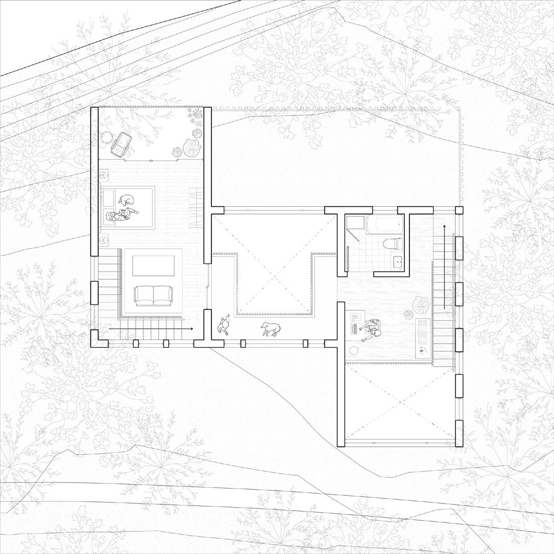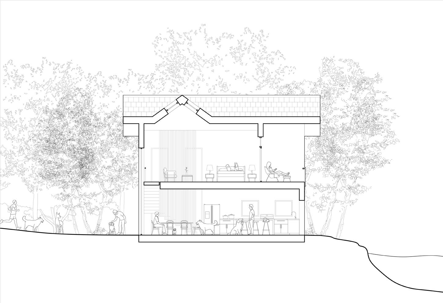 Located within the Riverbluffs Park, this dog daycare and residence lies fully immersed in its natural surroundings, offering plenty of exterior and interior spaces for canines to roam and socialize. In the center lies an inner courtyard that seamlessly blends the dogcare area with the human living space, fostering a harmonious coexistence between the two species.