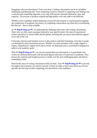 Don't let the stress of writing a dissertation hold you back. Trust ⇒ HelpWriting.net⇔ to provide the support and assistance you need to succeed. Contact us today to learn more about our services and take the first step towards completing your dissertation with confidence.