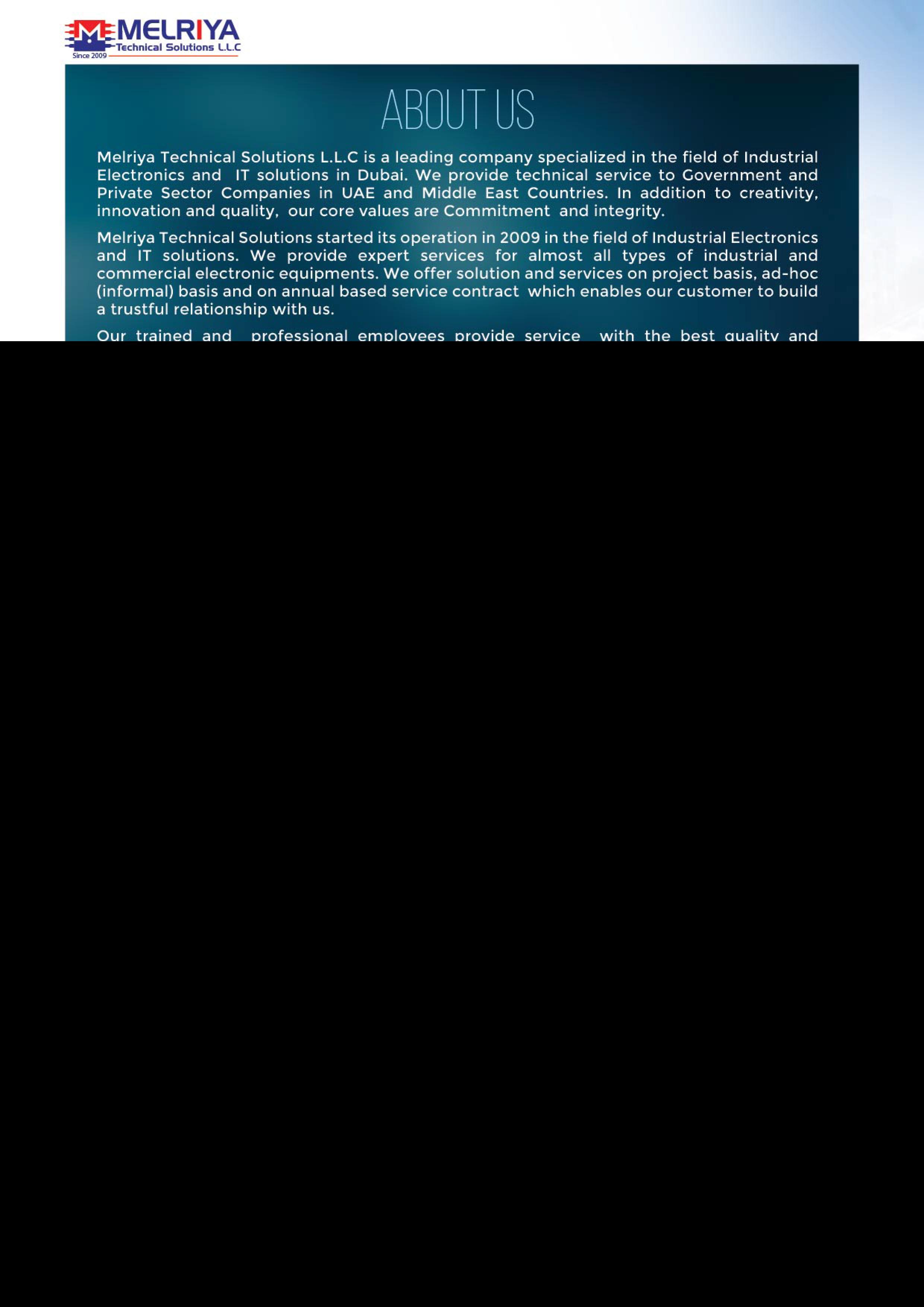 MELRIYA Technical Solutionsprovideexpert servicesforalmostall typesofindustrial and commercial electronicequipments Home AboutUs RepairServices PhotoGallery OurPro le Blog Enquiry ContactUs Address WarehouseNo6 JumaBel Ja aWarehouse StreetNo19(OppositeAntiqueMuseum) Al uozindustrial Area1,Dubai,UA E Call Us +971505958093 Email melriya@eimae Explore Contact Us Gallery Copyright©2023wwwmelriyacom All RightsReserved