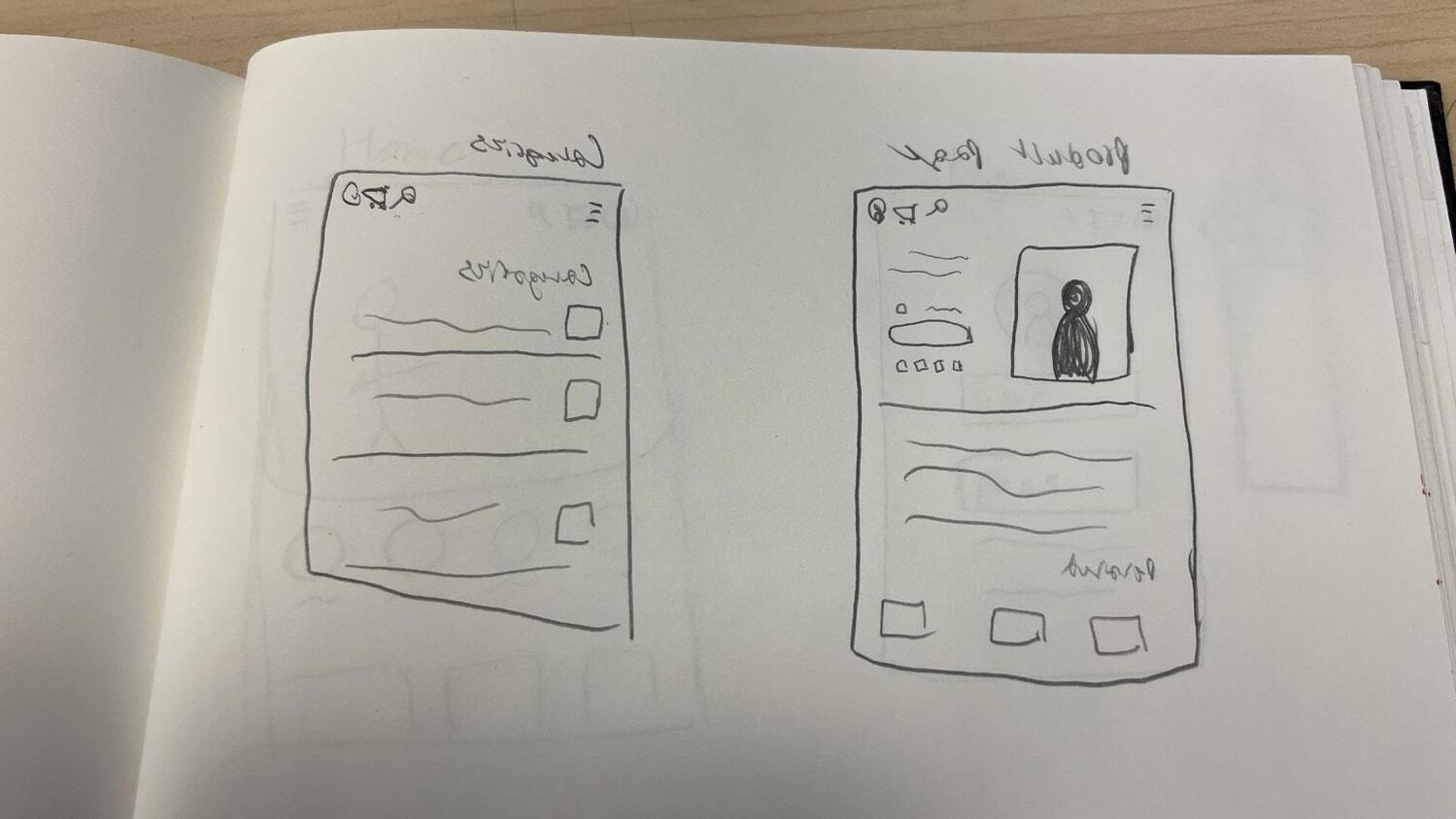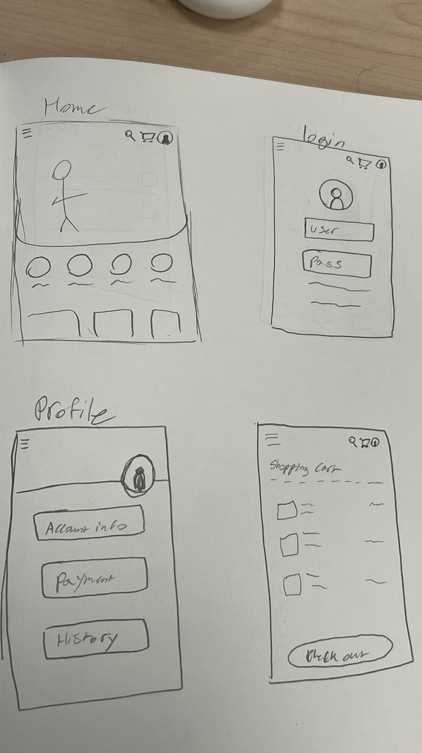 After looking up multiple examples of fashion apps in the app store I saw that they used simplified typography as the app logo. So, I did a compromise of the original logo and simplified the design with mostly showing typography while stile having the teeth symbolizing the mascot. I also made simple layouts of the different pages with their rough layouts.