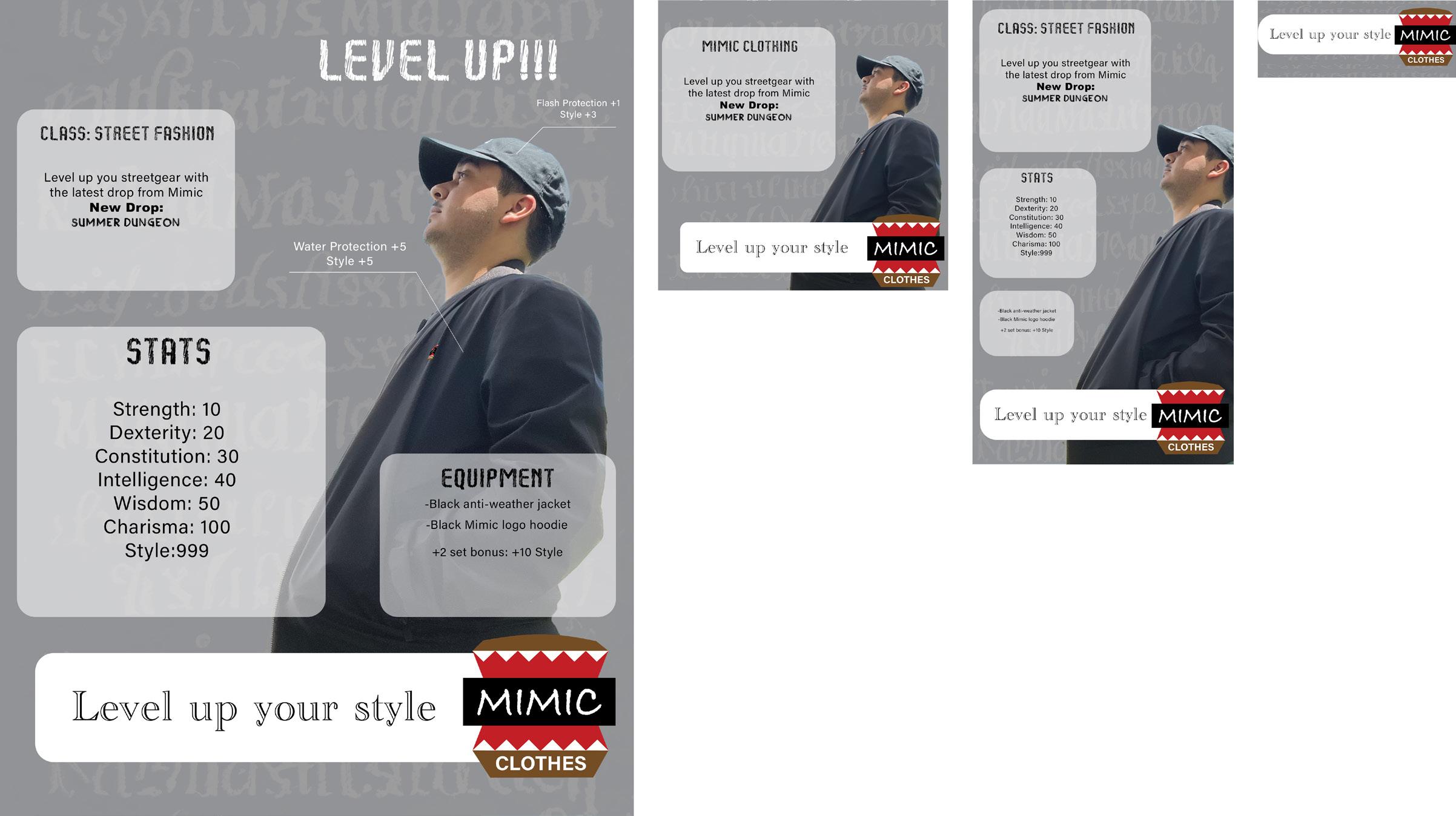 The concept behind this Ad campaign is for a RPG skill sheet themed Ad. I wanted to combine a modern interpretation of the medieval style of RPG skill sheets with streetwear fashion. I used a combination of vector shapes to make the sections. I used Ai generation to make the background texture behind everything.