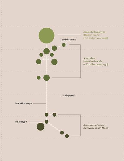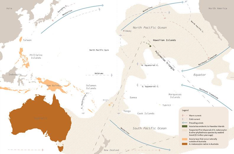 Graphic world map of Acacia koa migration, movement, and exchange. | Illustration by author.