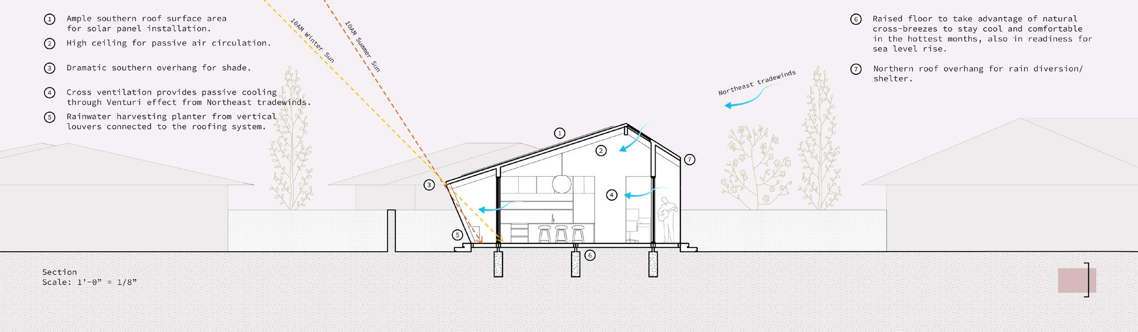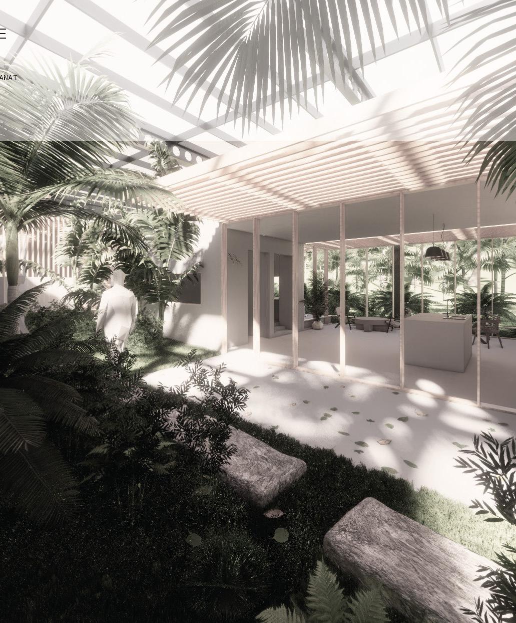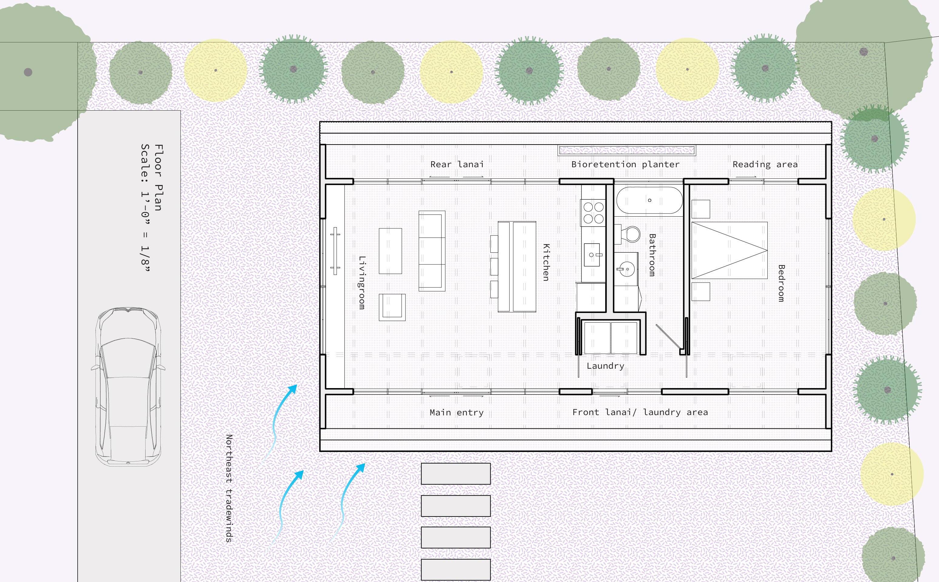 The main objective of my ARU design is to provide a passive, near net-zero/ low energy building for Kauai’s climate conditions. The ARU exterior is shaped by Kauai’s Summer + Winter Sun, frequency of rainfall, and the Northeast trade winds. The birth of the name “Wrapped” comes from the wood beams-turned-vertical louvers that act as rain diverters, which eventually get absorbed by the soil, or feed directly into a concrete bioretention planter. Moreover, the integration of rainwater harvesting systems at the rear, and solar panels on the Southern roof ensures a reduced carbon footprint, aligning with the philosophy of sustainable living. Wrapped is a testament to the synergy between climateconscious design and the rich tropical milieu of Kauai. This project is currently being developed as a prototype for County of Kauai.