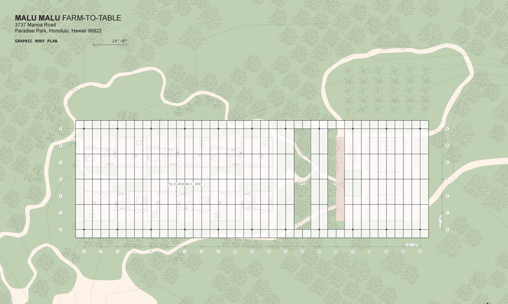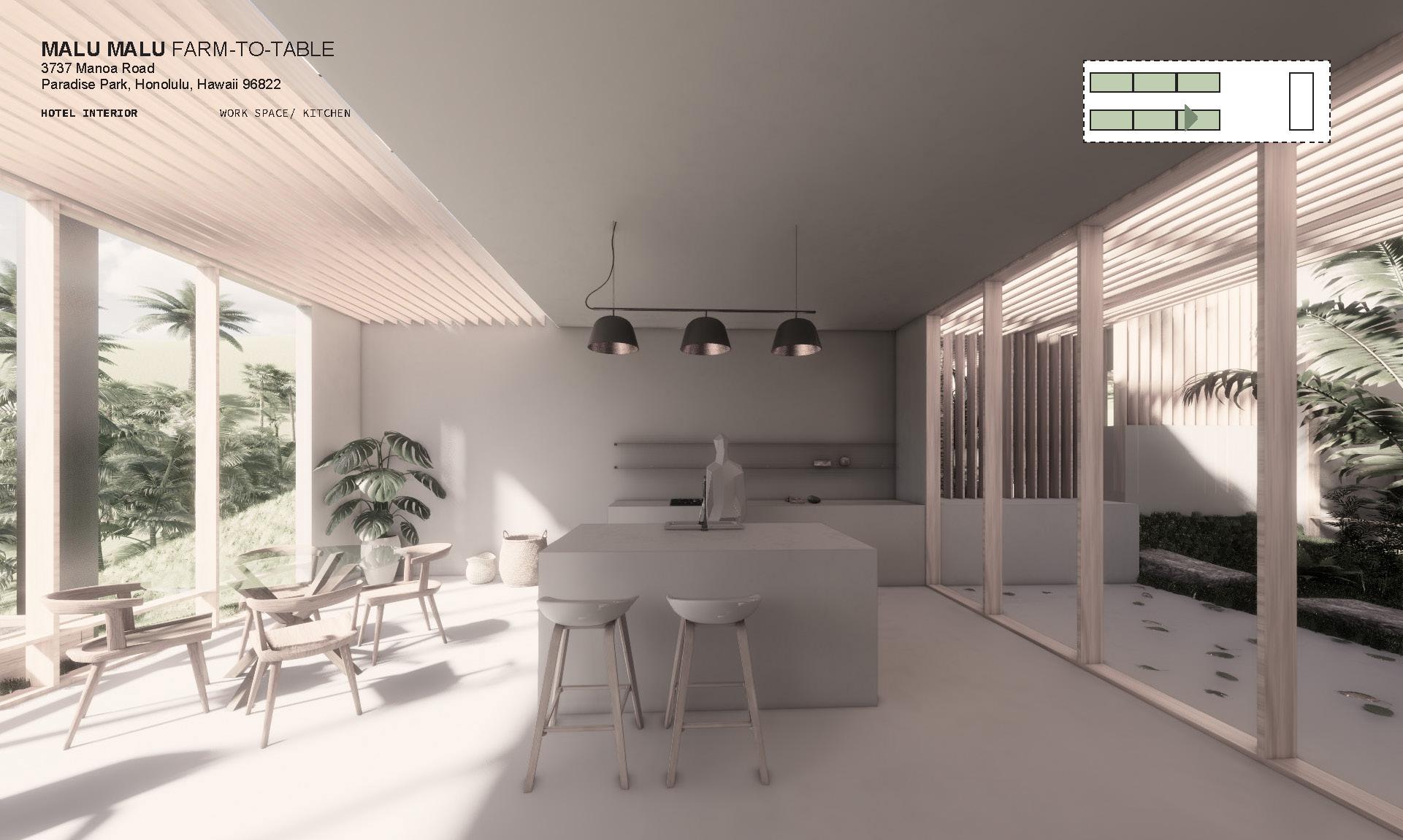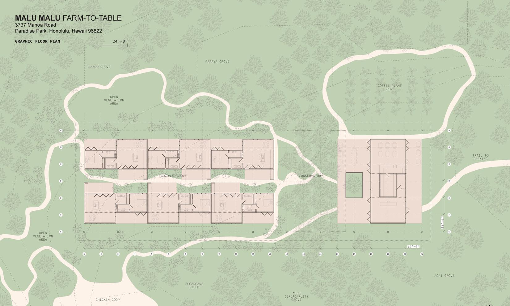 This conceptual project envisions a landscape hotel and educational retreat in the Manoa hills of Oʻahu, designed for a non-profit foundation focused on environmental education and conservation. The retreat offers a place-based hospitality experience that supports ecological learning and promotes food resilience through integrated programming.