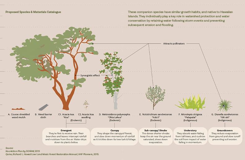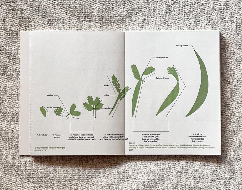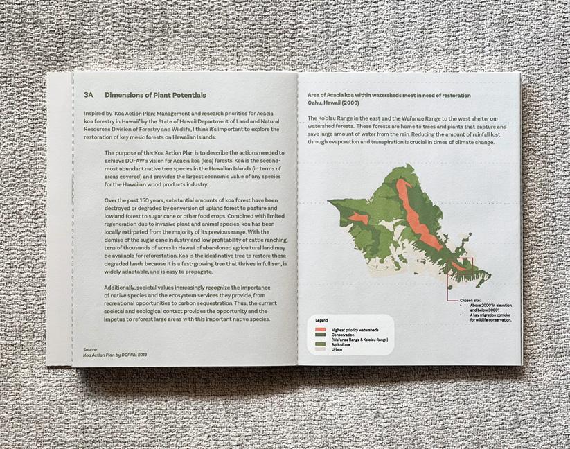 I produced a comprehensive book celebrating the Acacia koa, Hawaiʻi’s largest endemic tree, as an exploration of botany’s lessons for design. This research examined koa’s nitrogenfixing properties, phenology, morphogenesis, and its vital role in watershed and biodiversity resilience, while honoring its centuries-long cultural significance to Native Hawaiians. By deeply analyzing a single native species, the booklet illustrated how nature’s intelligence and evidence-based design strategies can inform regenerative, culturally grounded practice. This process clearly demonstrates my systemsbased, integrative design thinking — uniting ecological science, cultural knowledge, and resilient place-based stewardship.