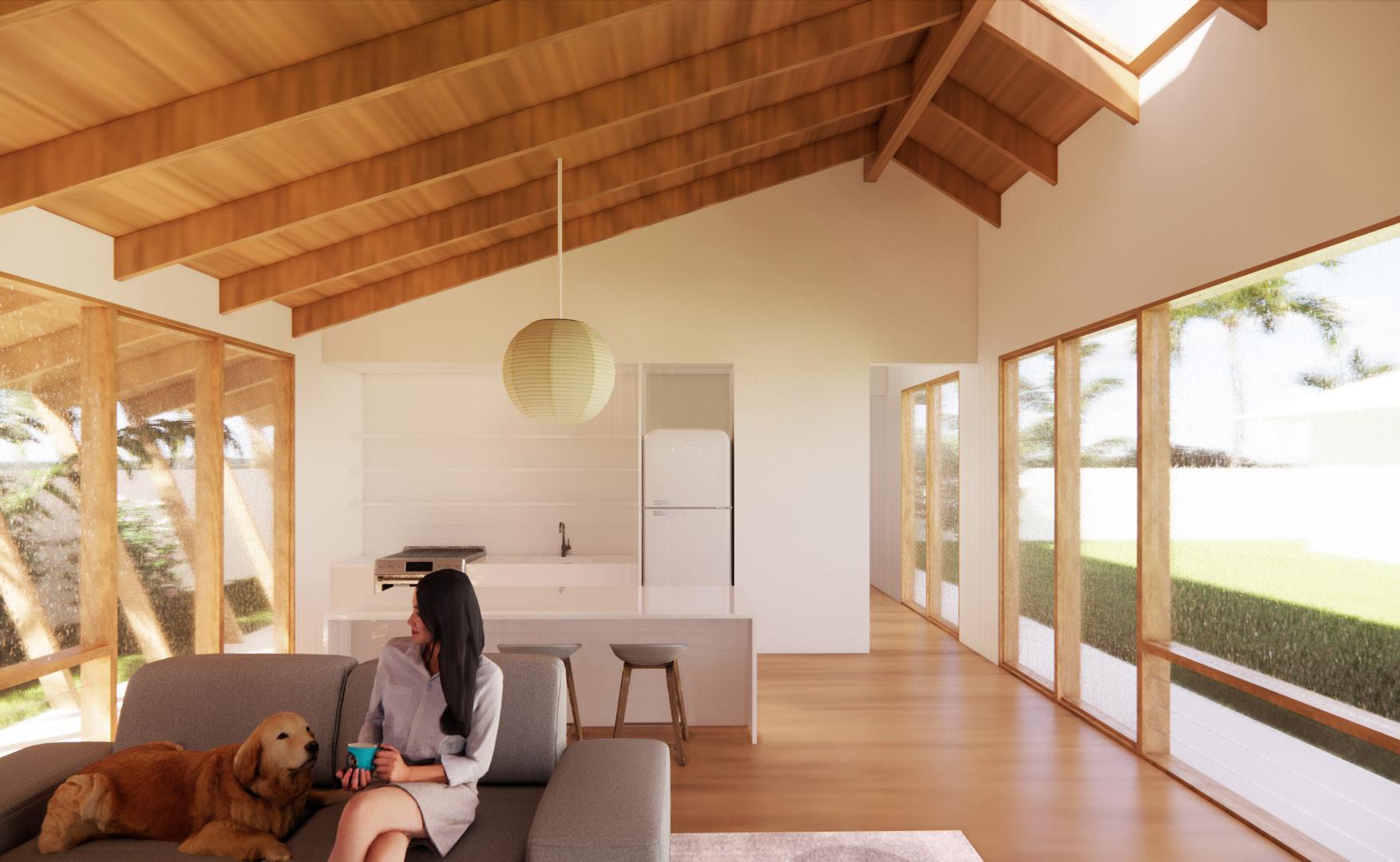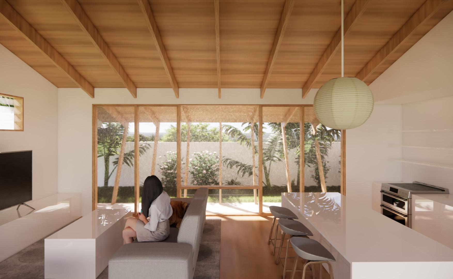 Render showing living room and kitchen experience in relationship to the rear lanai. | Render by author.