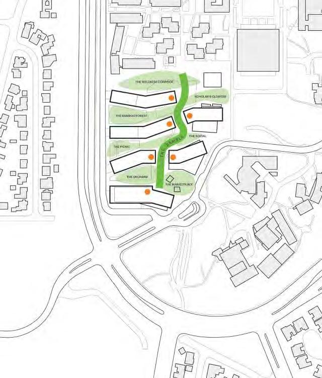Access to biophilia from building lobby placed along the meandering “ramble”.