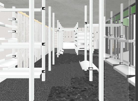 Model of merchandise display and floor finishes from main entry. | Render by author.