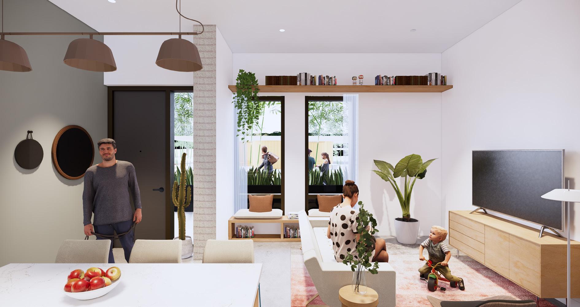 Interior render showing open living room and kitchen beyond. | Render by author.