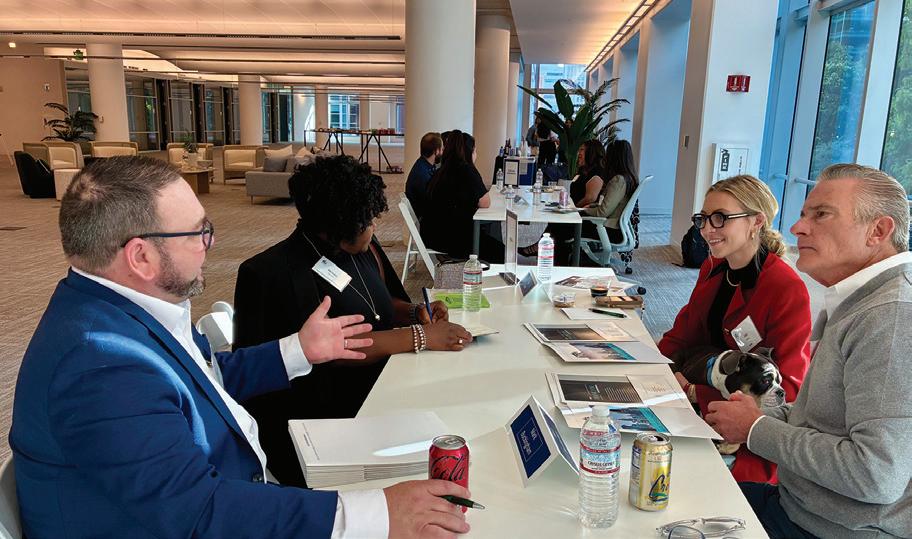 Top right: KR Johnston Construction team meets with Transwestern team. Lower right: American Building Service team gets advice from Hines team.
