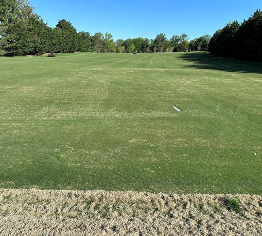The photo from April 20 of the #6 West tee shows that the bermudagrass has broken dormancy and is doing quite well in spite of the rollercoaster temperatures we have experienced this spring. Portions of this tee are slower to green up and grow-in for one reason: foot traffic from play while dormant. As you play the West, you will note tees without traffic are faring much better compared to undersized tees that experienced more play throughout the winter. These areas will either be resodded or will grow in once temperatures heat up.