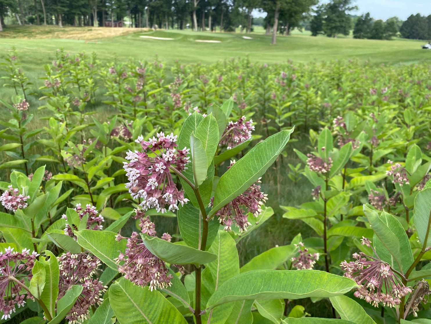 You probably know that Monarchs love Milkweed. But did you know that they need it? Monarchs will only lay their eggs on Milkweed (Asclepias spp.) because it is the only plant their caterpillars eat. Ingesting the toxic compounds found in the milky sap makes the Monarchs unpalatable to predators. Unfortunately, Monarch populations across the country have been declining, and one big cause is the loss of Milkweed habitat. It is with this in mind that our golf course superintendents are allowing naturally occurring stands of Common Milkweed to remain wherever they do not impact the playability and architectural integrity of the courses. After several years, there are now dense stands throughout high grass areas of the East and West courses. Milkweed also supports other pollinators, as a great nectar resource for a variety of bees and butterflies. Of course, these low maintenance areas still require annual mowing and weed control so they are not overrun with invasive species like wild raspberry, burn weed, and thistle. But these management practices can be adapted to preserve the Milkweed stands while the Monarch life cycle is in progress.
