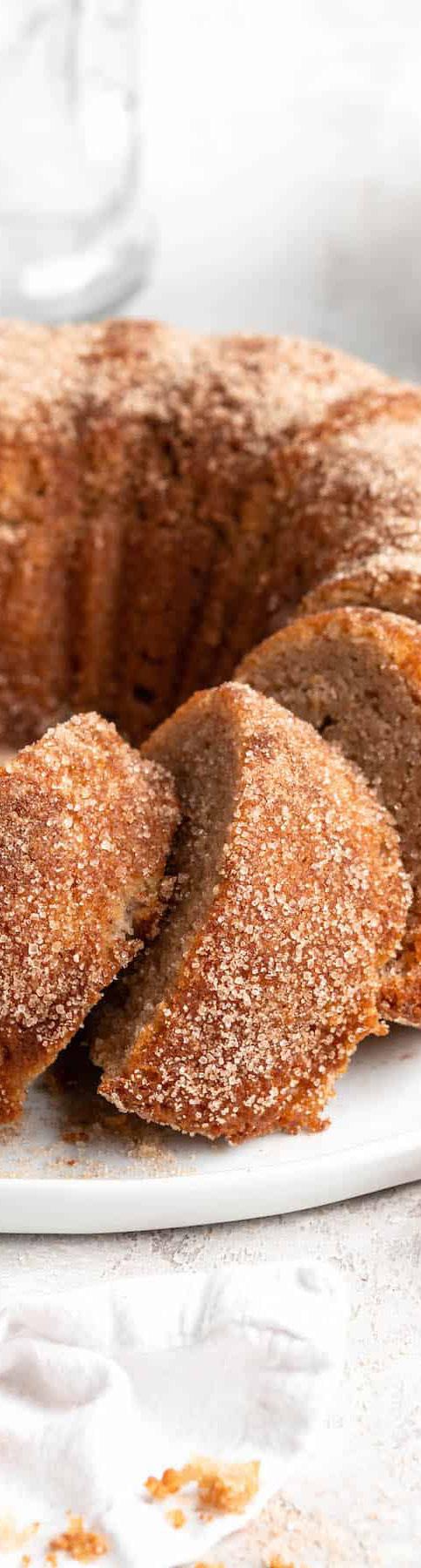 9. In a small bowl, stir together the sugar, cinnamon, nutmeg and salt. 10. Brush the cake all over with the brown butter. Sprinkle and press the cinnamon sugar into the cake right after brushing with the brown butter. You can rub the sugar onto the sides and the center so it sticks. Serve as desired!