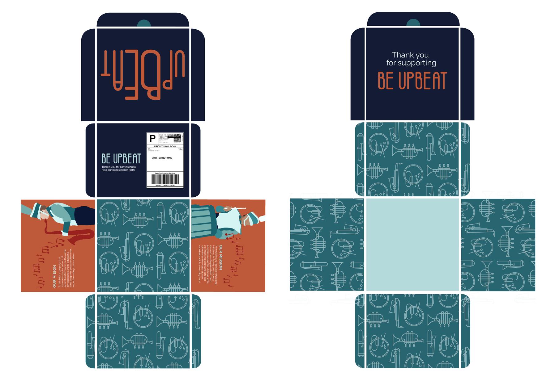 The Brochure serves as a quick introduction explaining the basis of the Be Upbeat campaign. It can easily be handed out to potential supporters and based both on university campus (such as music/art schools) or mailed out to those who aren’t able to access a participating campus.