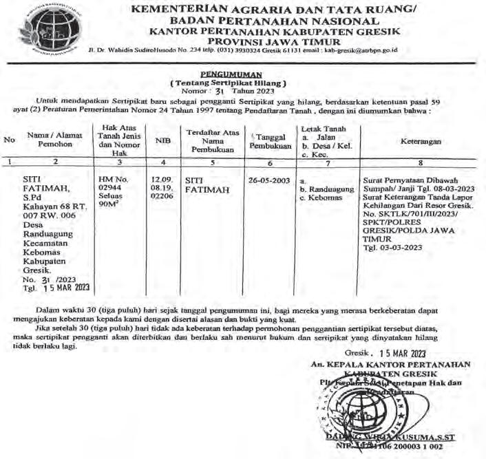 (tingkat penyidikan) yang dikeluarkan oleh Kep ala Kejaksaan Negeri Kabupaten Pasuruan No : pr int-01/M.5.41/Fd.2/03/2023 tanggal 16 Maret 2023. Atas perbuatan dugaan korupsi pengadaan tanah makam mantan Kepala Desa Rejoso Kidul seba: Pasal 2 Ayat (1) jo. Pasal 18 Undan g- Unda ng Nomor 31 Tahun 1999 tentang Pemberantasan Tindak Pidana Korupsi jo. Undang-Undang Nomor 20 Tahun 2001 Tentang Perubahan Atas Undang-Undang No-