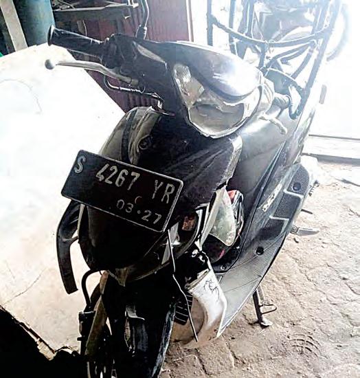 Kerasnya benturan terlihat dari kondisi motor korban yang rusak parah.
