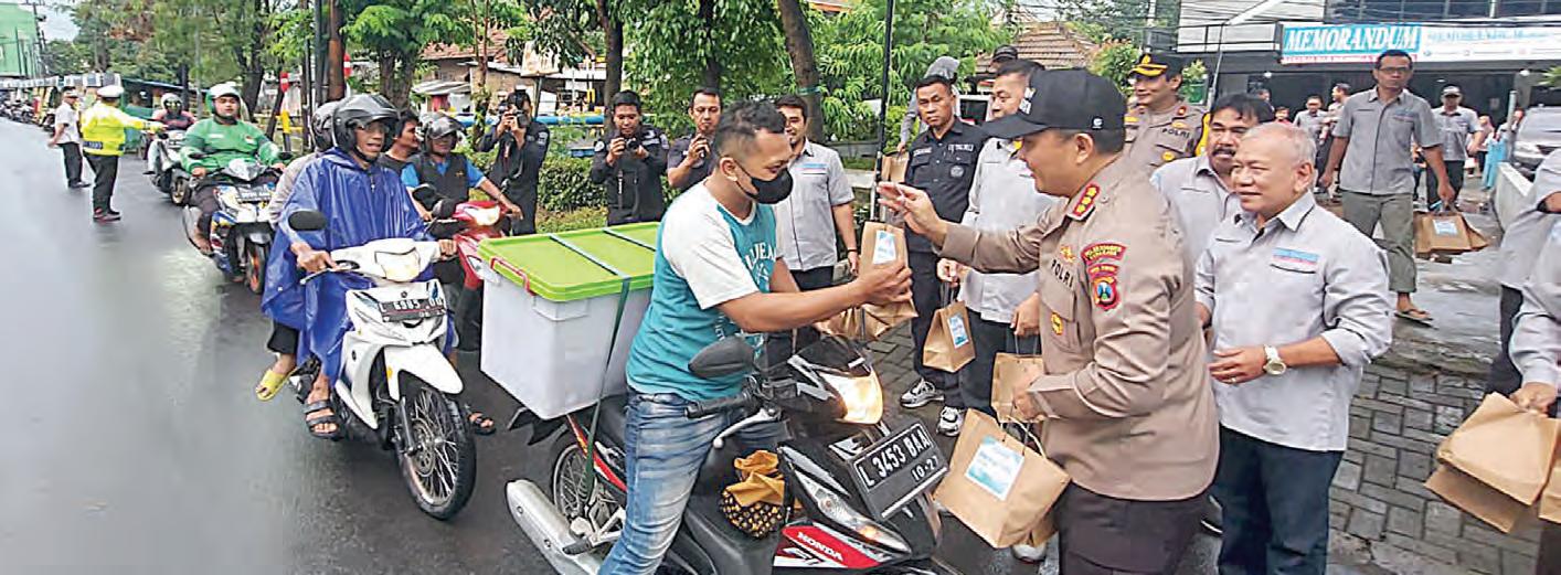 Kapolrestabes Surabaya Kombespol Pasma Royce didampingi Direktur Utama SKH Memorandum Choirul Shodiq membagikan takjil kepada pengguna jalan di depan kantor SKH