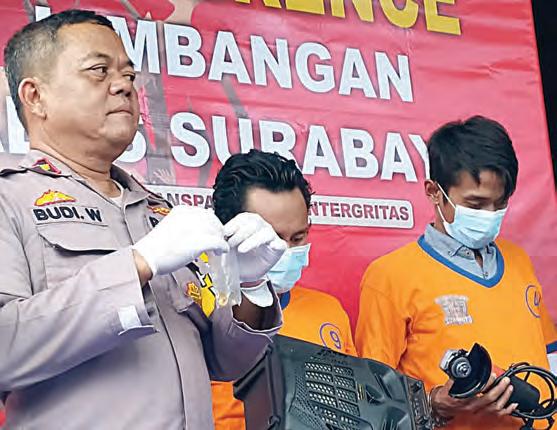 Kapolsek Jambangan Kompol Budi Waluyo menunjukkan terduga pelaku dan BB. Bersambung ke hal 2