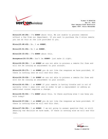 Ticket # 48345739 Dec 21, 2015 Chat Subject:FiOS Television Agent 4567: Elvin Hernandez