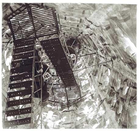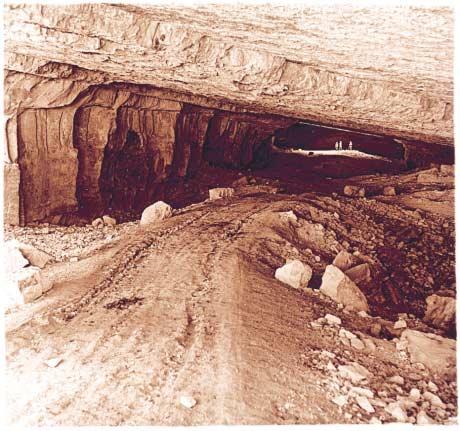 [Interior cantera. Al fondo 3 personas iluminadas por el sol]. V-31-16