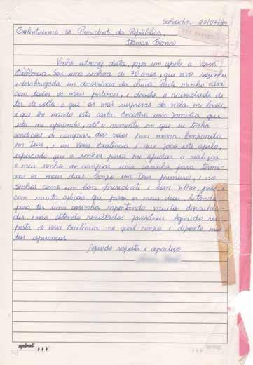 Venho atravéz desta, fazer um apelo a Vossa Excelência. Sou uma senhora de 70 anos, que vivo sozinha e desabrigada em decorrência da chuva. Perdi minha casa com todos os meus pertences, e devido a necessidade de ter de volta o que as más surpresas da vida me levou, é que lhe mando esta carta. Encontrei uma família que está me apoiando, até o momento em que eu tinha condições de comprar dois vãos para morar. Confiando em Deus, e em Vossa Excelência é que faço este apelo, esperando que o senhor possa me ajudar a realizar o meu sonho de comprar uma casinha para terminar os meus dias. Confio em Deus primeiro, e no Senhor como um bom presidente e bom filho, pois é com muita aflição que passo os meus dias, lutando para ter uma casinha enfrentando muitas dificuldades, e não obtendo resultados favoráveis. Aguardo resposta de Vossa Excelência, no qual confio e deposito muitas esperanças.