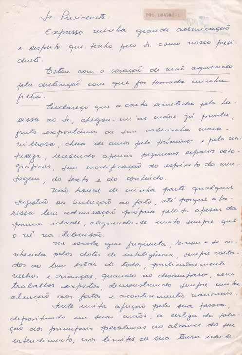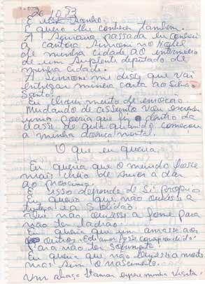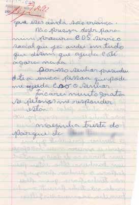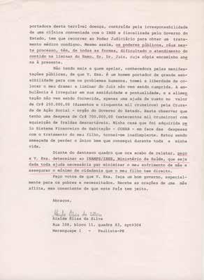 Não tendo mais a quem apelar, conhecedora pelas manifestações públicas, de que V. Exa. é um homem portador de grande sensibilidade para com os problemas humanos, tomei a liberdade de colocar o meu drama: a liminar do Juiz não vem sendo cumprida. A ambulância é irregular em sua assiduidade e pontualidade, e a alimentação não vem sendo fornecida, apenas uma ajuda de custo no valor de Cr$ 250.000,00 (duzentos e cinquenta mil cruzeiros) pela Cruzada de Ação Social – órgão do Governo do Estado. Basta observar que tenho uma despesa de Cr$ 700.000,00 (setecentos mil cruzeiros) com aquisição de fraudas descartáveis. Minha casa que foi adquirida pelo Sistema Financeiro de Habitação – COHAB – em face das despesas com o tratamento do meu filho, tornei-me inadimplente. Estou sendo ameaçada de perder o único bem que consegui durante toda a minha vida.