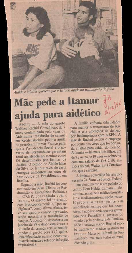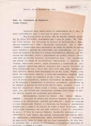 Exmo. Sr. Presidente da República Itamar Franco. Venho, por meio desta, levar ao conhecimento de V. Exa. E pedir providências para o caso que eu passo a relatar: Sou Alaíde Elias da Silva, mãe de Walther Rachid, portador do vírus HIV (AIDS), atualmente com 7 anos de idade. Em 1986, meu filho Walther foi internado na Clínica de Reidratação e Emergências Pediátricas – CREP – Recife-PE, conveniada com o INSS/INAMPS e fiscalizada pela Secretária de Saúde do Estado de Pernambuco. Durante o período de internação, por negligência, ou seja, falta de controle de Raio X e outras providências médicas, que deveriam ser adotadas, houve o agravamento do quadro clínico, evoluindo para um derrame pleural, utilizando-se para tal tratamento uma grande variedade de antibióticos, debilitando o organismo da criança, adquirindo anemia, sendo necessária a transfusão de sangue, segundo prescrição médica. Acontece que o sangue utilizado estava contaminado com o vírus do HIV. Dois anos após este tratamento, essa terrível doença AIDS manifestou-se em meu filho. Passei, juntamente com toda minha família, a viver uma verdadeira tragédia para assegurar o mínimo de cidadania ao meu filho. Meu marido, Walter Luis da Silva Constâncio, modesto funcionário da Empresa Brasileira de Correios e Telégrafos, é carteiro, atualmente percebendo como salário a quantia de Cr$ 2.102.000,00 (dois milhões, cento e dois mil cruzeiros). Tenho ainda dois filhos, respectivamente 18 e 09 anos, que, em virtude dos transtornos causados pela doença de Walter Rachid, passam por problemas psicológicos.