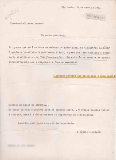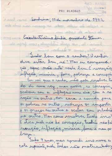 Um retrato do Brasil. No acervo de cerca de 60 mil cartas recebidas entre 1992 e 1994 e preservadas por este Memorial encontramos um registro sensível e sentimental do desemprego, do caos econômico provocado por uma inflação assustadora, da fome, da insegurança jurídica, da precariedade dos presídios, da preocupação internacional com a Amazônia, da desconfiança na seguridade social, mas também do amor à nação, da solidariedade, do amor, da resistência, do orgulho com o esporte e com a cultura nacionais e do desejo de participação.