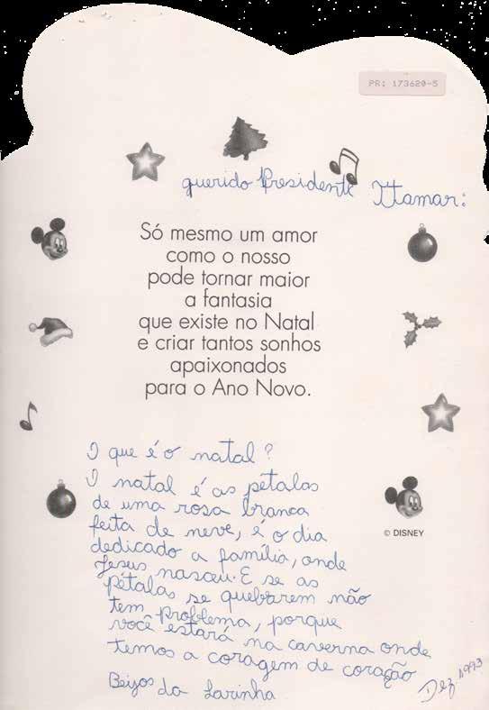 Ao longo dos 733 dias em que assinou como Presidente da República Federativa do Brasil, Itamar carregou consigo a confiança de uma nação em dias melhores. Testemunho do período econômico e social mais dramático da história nacional nas últimas três décadas, o conjunto de cartas recebidas por ele nesse período traz a inscrição de uma esperança resguardada em cada casa, em cada negócio e em cada instituição. Dos pedidos aos lamentos, esses escritos preservavam expectativas. As crianças desenhavam e clamavam por investimentos em educação, por emprego para os pais, por menos miséria e por mais futuro.
