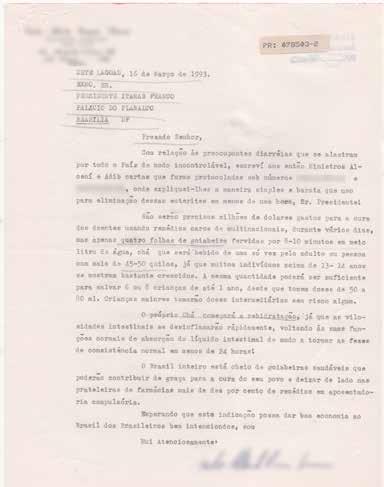 Prezado Senhor, Com relação às preocupantes diarréias que se alastram por todo o País de modo incontrolável, escreví aos então Ministros Alcení e Adib cartas que foram protocoladas sob números [...], onde expliquei-lhes a maneira simples e barata que uso para eliminação dessas enterites em menos de uma hora, Sr. Presidente!