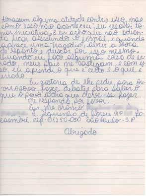 Até hoje, eu esperei que os adultos tomassem alguma atitude contra isso, mas como isso não aconteceu, eu resolvi tomar iniciativa. E eu acho que não adianta ficar assistindo o jornal, e quando aparece uma tragédia, abrir a boca de espanto e deixar por isso mesmo. Quando eu faço alguma coisa de errado, meus pais me castigam, e com isso, eu aprendi o que é certo e o que é errado.