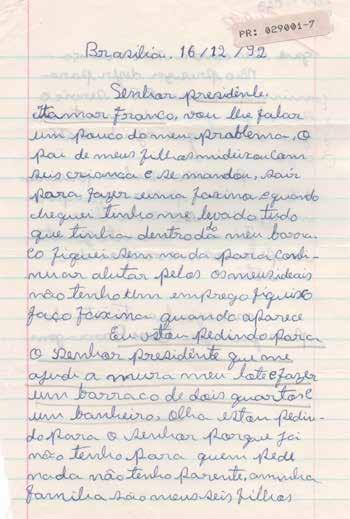 Eu estou pedindo para o senhor presidênte que me ajude a mura meu lote e fazer um barraco de dois quartos e um banheiro, olha estou pedindo para o senhor porque já não tenho para quem pedi nada não tenho parente. aminha família são meus seis filhos que eses ainda são criança.