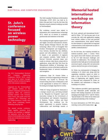 Memorial hosted international workshop on information theory the local, national and international levels,” said Dr. Dobre. “ICT has become part of our everyday life, with wide applications ranging from wireless cellular to local and personal area communications, from optical wireless for short distance to optical fiber for long-haul communications, from underwater acoustic to satellite communications.” For the first time, the workshop included an industry-academia panel, a session where top experts from both business and research in the ICT field discussed challenges and rewards of collaboration. The workshop also included invited talks given by internationally renowned experts, along with oral and poster sessions selected from peer-reviewed papers. Dr. Dobre was instrumental in bringing the workshop to St. John’s and, along with the organizing committee, spared no effort to make it one of the best. Dr. Greg Naterer is dean of Engineering and Applied Science at Memorial and commends Dr. Dobre on her initiative and enthusiasm to bring the workshop to St. John’s. “This conference provided a great opportunity to raise Memorial’s profile nationally and interact with leading researchers on the latest emerging technologies of ICT,” said Dr. Naterer. “Special thanks to Dr. Dobre for her efforts and exceptional leadership of the workshop.” For more information on CWIT 2015, please visit http://cwit.ca/2015/index.html. ■■■