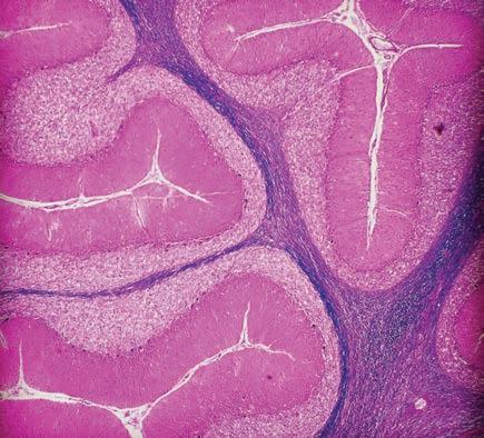 This image shows a stained section of the brain’s cerebellar cortex under the microscope. On first glance, I see a saccharine vision of pure pink and purple awesomeness. On second glance, I see widespread damage to a Purkinje neuron in a person who lived with Niemann-Pick C disease.