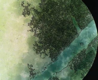 Art from artifact: Glass slides for viewing under the microscope are subject to artifact, such as air bubbles under the coverslip, which can obscure the tissue beneath. These oft maligned “artifacts” can produce amazing abstract designs, inspiring the imagination. Here, artifact acts to transform these microscopic sections of the brain’s cerebral cortex into Strange Landscapes. These images are glass slides of stained human cerebral cortex, photographed through the oculars of a microscope with iPhone 6. The photos were then digitally painted in Procreate.