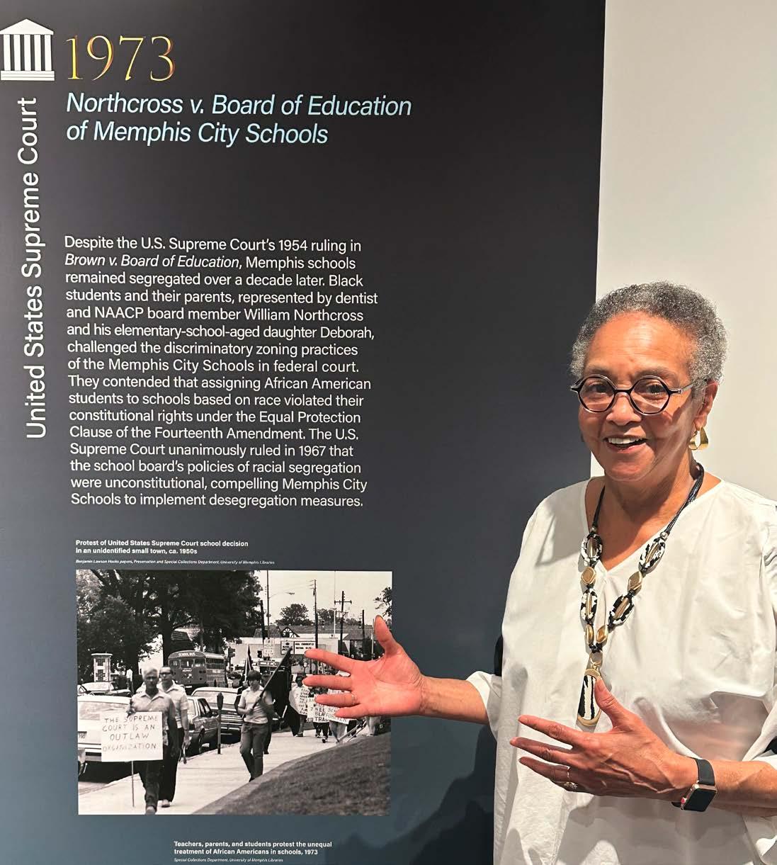 Pictured at the MBA 150th exhibit, Deborah Northcross stands next to the 1973 landmark case she was involved with as an elementary school student. In Northcross v. Board of Education of Memphis City Schools, Deborah and others challenged the discriminatory zoning practices of MCS in federal court.