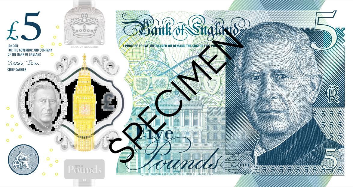 Nowe wzory banknotów we wszystkich czterech nominałach - 5, 10, 20 i 50 funtów - zostały zaprezentowane w grudniu 2022 roku. Wizerunek monarchy na awersie oraz w przezroczystym okienku zabezpieczającym jest jedyną zmianą w stosunku do używanych obecnie banknotów, co oznacza, że na odwrotnej stronie pozostaną portrety odpowiednio Winstona Churchilla, Jane Austin, Williama Turnera i Alana Turinga.