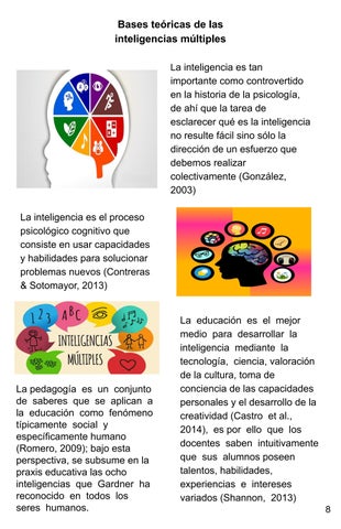 Lapedagogía es un conjunto de saberes que se aplican a la educación como fenómeno típicamente social y específicamentehumano (Romero,2009);bajoesta perspectiva,sesubsumeenla praxiseducativalasocho inteligencias que Gardner ha reconocido en todos los seres humanos.