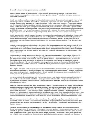 E cerca da noite nós volvemos para as naus com nossa lenha. Eu creio, Senhor, que não dei ainda conta aqui a Vossa Alteza do feitio de seus arcos e setas. Os arcos são pretos e compridos, e as setas compridas; e os ferros delas são canas aparadas, conforme Vossa Alteza verá alguns que creio que o Capitão a Ela há de enviar. Quarta-feira não fomos em terra, porque o Capitão andou todo o dia no navio dos mantimentos a despejá-lo e fazer levar às naus isso que cada um podia levar. Eles acudiram à praia, muitos, segundo das naus vimos. Seriam perto de trezentos, segundo Sancho de Tovar que para lá foi. Diogo Dias e Afonso Ribeiro, o degredado, aos quais o Capitão ontem ordenara que de toda maneira lá dormissem, tinham voltado já de noite, por eles não quererem que lá ficassem. E traziam papagaios verdes; e outras aves pretas, quase como pegas, com a diferença de terem o bico branco e rabos curtos. E quando Sancho de Tovar recolheu à nau, queriam vir com ele, alguns; mas ele não admitiu senão dois mancebos, bem dispostos e homens de prol. Mandou pensar e curá-los mui bem essa noite. E comeram toda a ração que lhes deram, e mandou dar-lhes cama de lençóis, segundo ele disse. E dormiram e folgaram aquela noite. E não houve mais este dia que para escrever seja. Quinta-feira, derradeiro de abril, comemos logo, quase pela manhã, e fomos em terra por mais lenha e água. E em querendo o Capitão sair desta nau, chegou Sancho de Tovar com seus dois hóspedes. E por ele ainda não ter comido, puseram-lhe toalhas, e veio-lhe comida. E comeu. Os hóspedes, sentaram-no cada um em sua cadeira. E de tudo quanto lhes deram, comeram mui bem, especialmente lacão cozido frio, e arroz. Não lhes deram vinho por Sancho de Tovar dizer que o não bebiam bem. Acabado o comer, metemo-nos todos no batel, e eles conosco. Deu um grumete a um deles uma armadura grande de porco montês, bem revolta. E logo que a tomou meteu-a no beiço; e porque se lhe não queria segurar, deram-lhe uma pouca de cera vermelha. E ele ajeitou-lhe seu adereço da parte de trás de sorte que segurasse, e meteu-a no beiço, assim revolta para cima; e ia tão contente com ela, como se tivesse uma grande jóia. E tanto que saímos em terra, foi-se logo com ela. E não tornou a aparecer lá. Andariam na praia, quando saímos, oito ou dez deles; e de aí a pouco começaram a vir. E parece-me que viriam este dia a praia quatrocentos ou quatrocentos e cinqüenta. Alguns deles traziam arcos e setas; e deram tudo em troca de carapuças e por qualquer coisa que lhes davam. Comiam conosco do que lhes dávamos, e alguns deles bebiam vinho, ao passo que outros o não podiam beber. Mas quer-me parecer que, se os acostumarem, o hão de beber de boa vontade! Andavam todos tão bem dispostos e tão bem feitos e galantes com suas pinturas que agradavam. Acarretavam dessa lenha quanta podiam, com mil boas vontades, e levavam-na aos batéis. E estavam já mais mansos e seguros entre nós do que nós estávamos entre eles. Foi o Capitão com alguns de nós um pedaço por este arvoredo até um ribeiro grande, e de muita água, que ao nosso parecer é o mesmo que vem ter à praia, em que nós tomamos água. Ali descansamos um pedaço, bebendo e folgando, ao longo dele, entre esse arvoredo que é tanto e tamanho e tão basto e de tanta qualidade de folhagem que não se pode calcular. Há lá muitas palmeiras, de que colhemos muitos e bons palmitos. Ao sairmos do batel, disse o Capitão que seria bom irmos em direitura à cruz que estava encostada a uma árvore, junto ao rio, a fim de ser colocada amanhã, sexta-feira, e que nos puséssemos todos de joelhos e a beijássemos para eles verem o acatamento que lhe tínhamos. E assim fizemos. E a esses dez ou doze que lá estavam, acenaram-lhes que fizessem o mesmo; e logo foram todos beijá-la. Parece-me gente de tal inocência que, se nós entendêssemos a sua fala e eles a nossa, seriam logo cristãos, visto que não têm nem entendem crença alguma, segundo as aparências. E portanto se os degredados que aqui hão de ficar aprenderem bem a sua fala e os entenderem, não duvido que eles, segundo a santa tenção de Vossa Alteza, se farão cristãos e hão de crer na nossa santa fé, à qual praza a Nosso Senhor que os traga, porque certamente esta gente é boa e de bela simplicidade. E imprimir-se-á facilmente neles qualquer cunho que lhe quiserem dar, uma vez que Nosso Senhor lhes deu bons corpos e bons rostos, como a homens bons. E o Ele nos para aqui trazer creio que não foi sem causa. E portanto Vossa Alteza, pois tanto deseja acrescentar a santa fé católica, deve cuidar da salvação deles. E prazerá a Deus que com pouco trabalho seja assim! Eles não lavram nem criam. Nem há aqui boi ou vaca, cabra, ovelha ou galinha, ou qualquer outro animal que esteja acostumado ao viver do homem. E não comem senão deste inhame, de que aqui há muito, e dessas sementes e frutos que a terra e as árvores de si deitam. E com isto andam tais e tão rijos e tão nédios que o não somos nós tanto, com quanto trigo e legumes comemos. Nesse dia, enquanto ali andavam, dançaram e bailaram sempre com os nossos, ao som de um tamboril nosso, como se fossem mais amigos nossos do que nós seus. Se lhes a gente acenava, se queriam vir às naus, aprontavam-se logo para isso, de modo tal, que se os convidáramos a todos, todos vieram. Porém não levamos esta noite às naus senão quatro ou cinco; a saber, o Capitão-mor, dois; e Simão de Miranda, um que já trazia por pagem; e Aires Gomes a outro, pagem também. Os que o Capitão trazia, era um deles um dos seus hóspedes que lhe haviam trazido a primeira vez quando aqui chegamos -- o