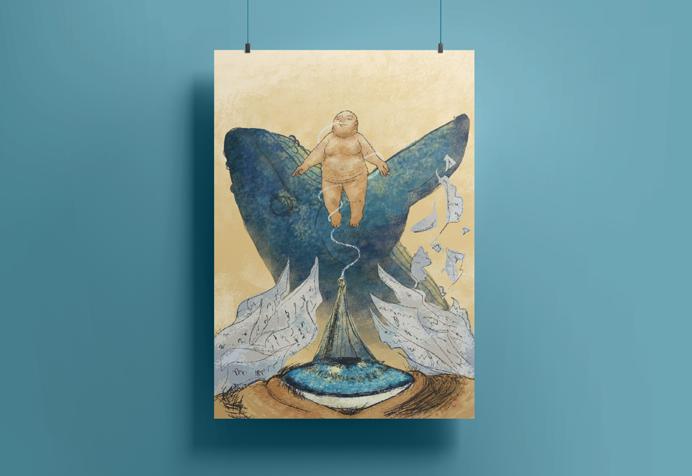本作品來自《我的鯨魚爸爸》(The Whale)觀影後,對於劇情與演員中表達的故事感 到觸動而創作。飄浮的男人,他與過往的傷疤、慾望、渴望與真實的自己(擱淺的鯨魚) 相遇。漂浮的紙張與鋼筆不僅包含他對女兒文筆的共鳴,也是未曾說出口的愛與心聲。