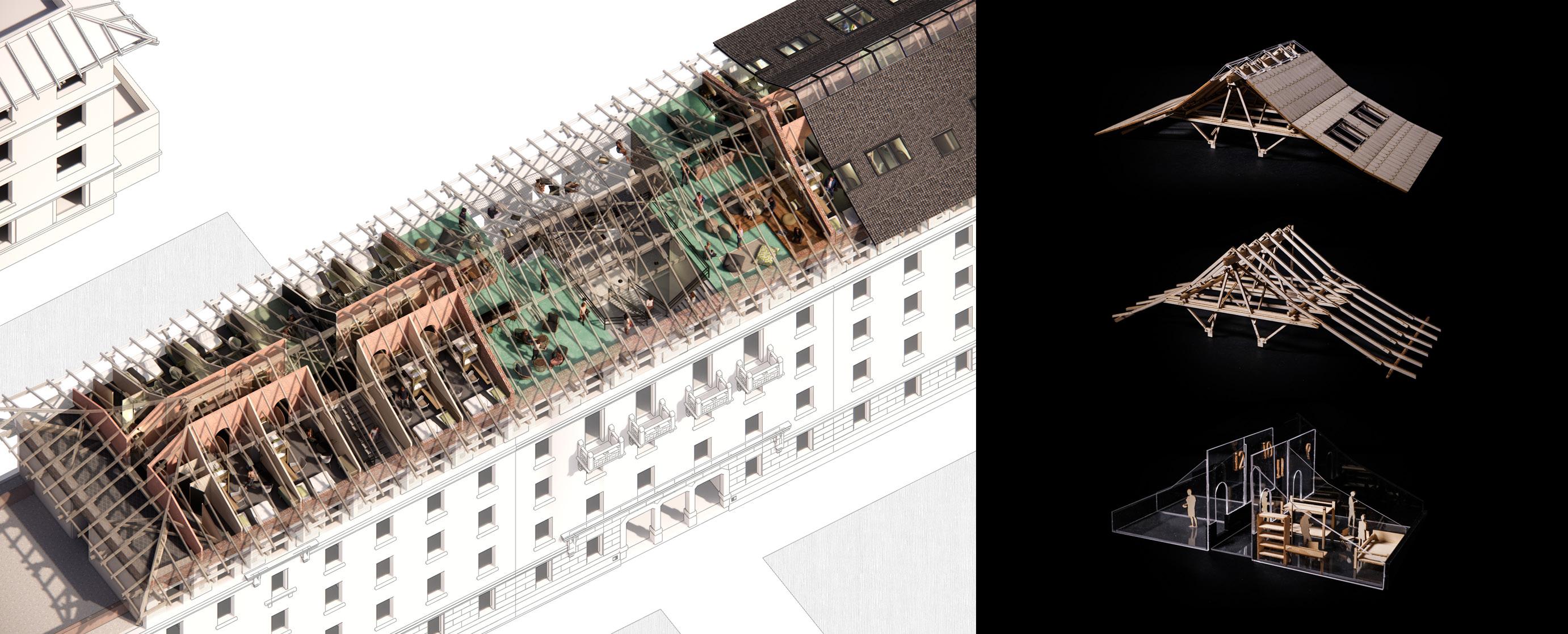 This is a project I did during my undergraduate studies at Tsinghua University on adaptive reuse. The project transforms the roof of a 70-year-old building at Tsinghua University into a hostel, addressing the shortage of summer accommodation for visiting students. Based on on-site measurements, documentation, and research, the design carefully respects the original structure by largely preserving the roof while creating meaningful spaces beneath and between it.